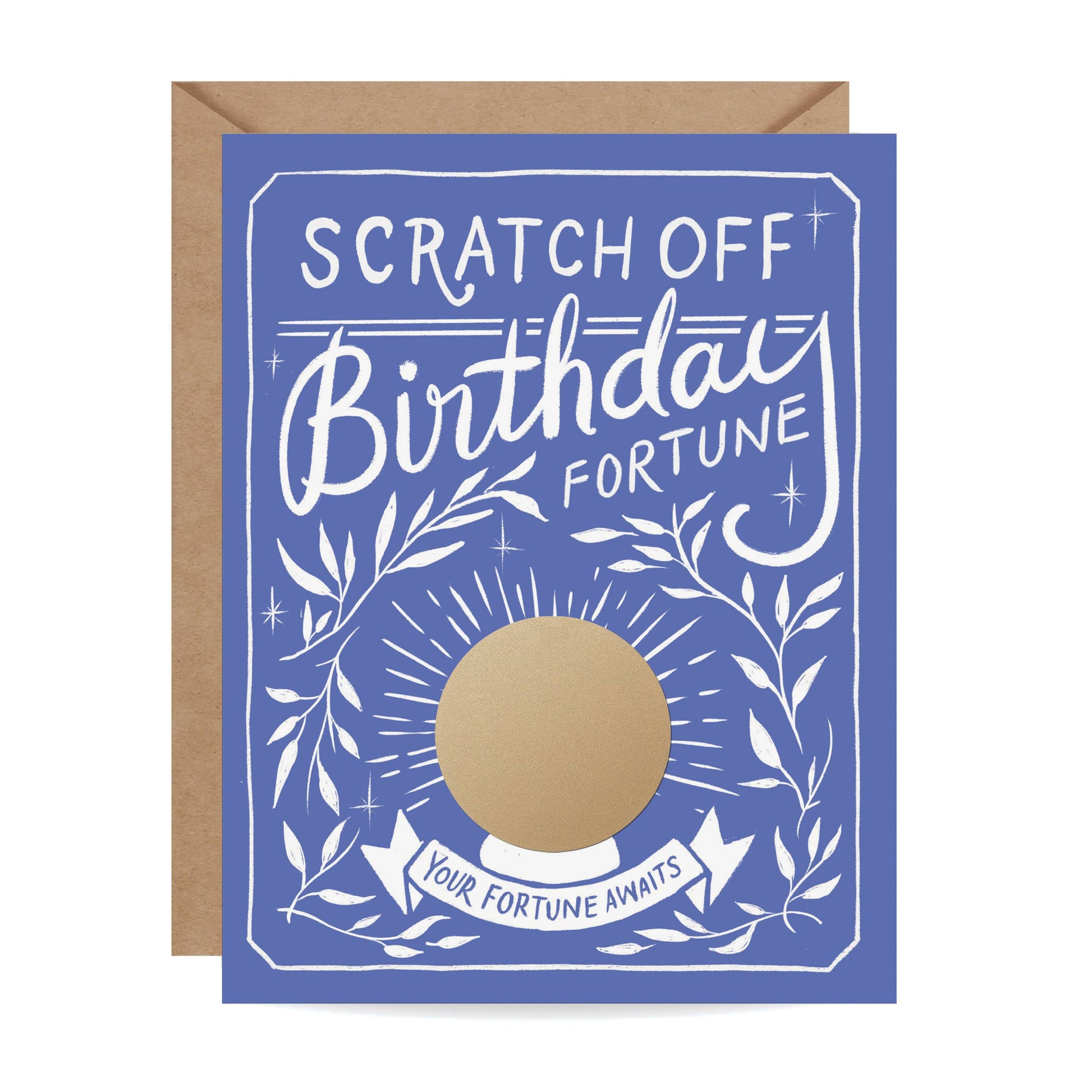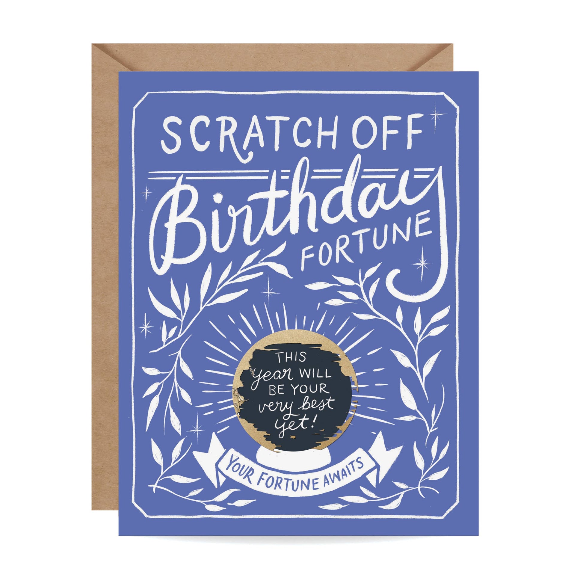 Scratch-off Birthday Fortune Hidden Message: "This year will be your very best yet". • Boutique size folded greeting card (5.5" x 4.25") • Blank inside • A2 brown kraft envelope (5.75” x 4.5”) • Scratch with a coin to reveal hidden message/image • Packaged in a clear cellophane sleeve • Outer sticker highlights this card’s special feature • Instructions included • Sustainably printed in the USA All mysteries are revealed with this whimsical scratch-off birthday card! Scratch the golden "crystal ball" with a coin to reveal the surprise message. *All Inklings scratch-off cards come packaged with a photo insert in the back showing exactly what the recipient will see under the sticker.