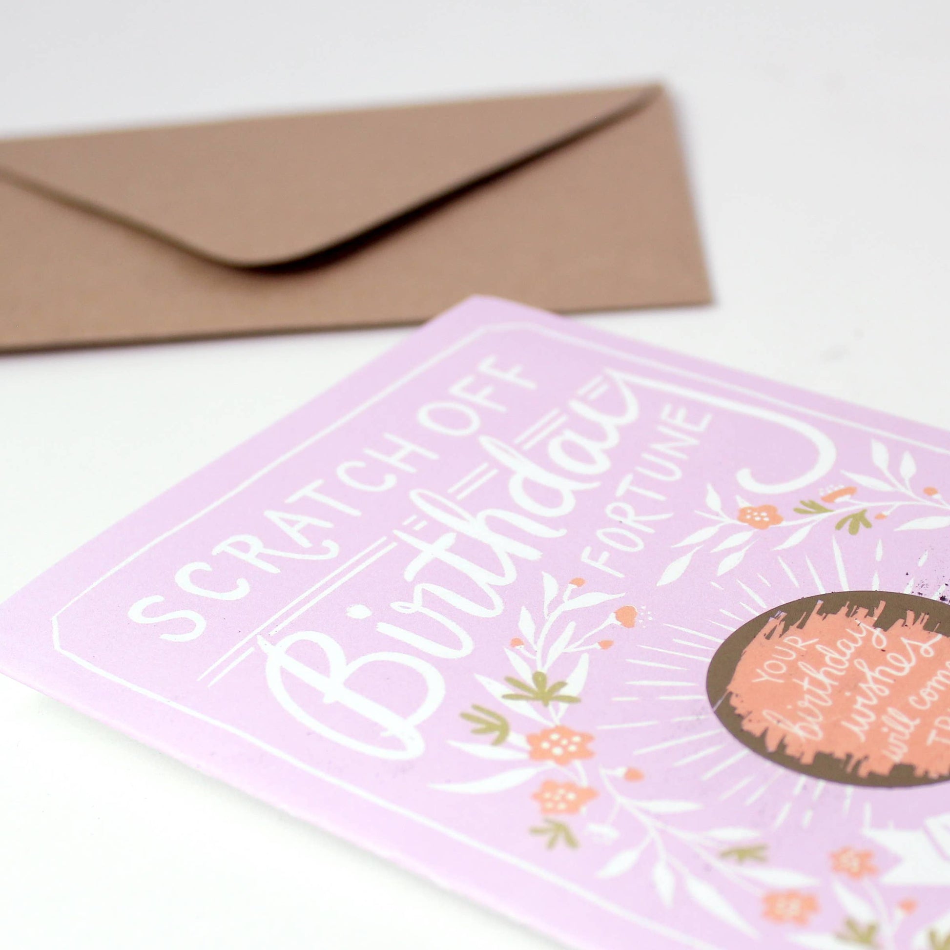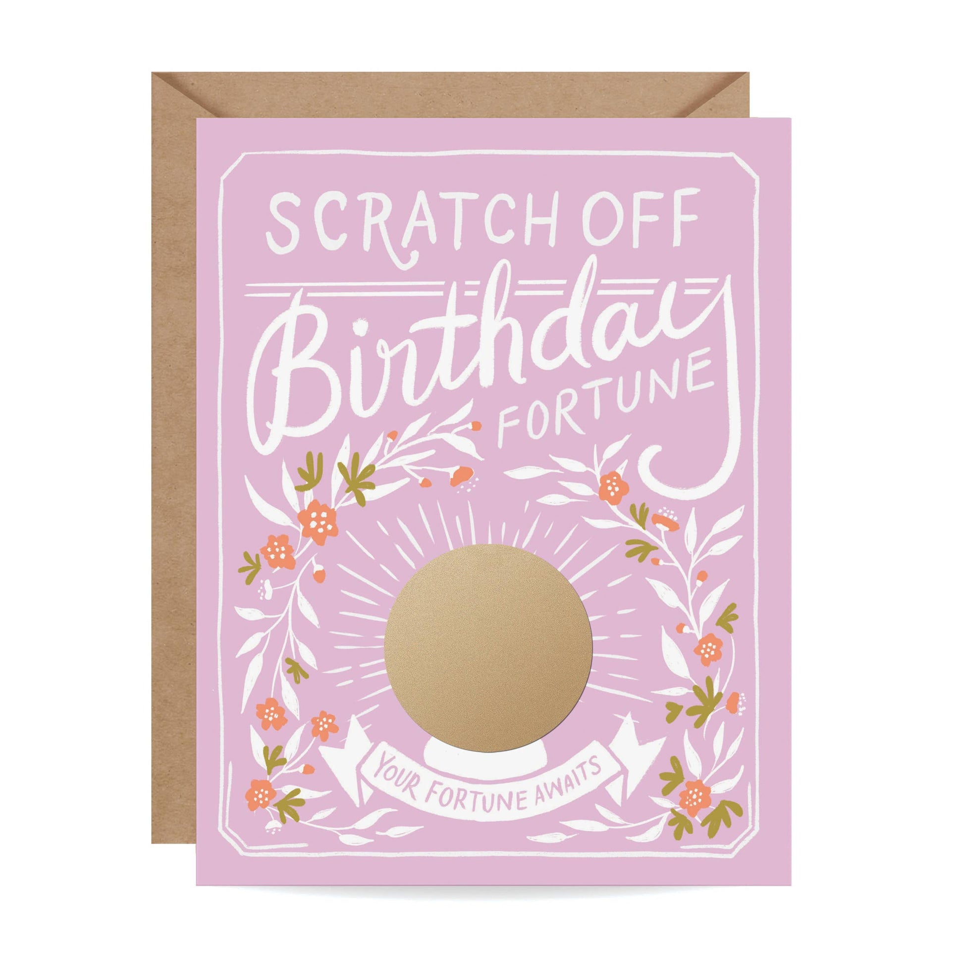Scratch-off Birthday Fortune Hidden Message: "All your wishes will come true!" • Boutique size folded greeting card (5.5" x 4.25") • Blank inside • A2 brown kraft envelope (5.75” x 4.5”) • Scratch with a coin to reveal hidden message/image • Packaged in a clear cellophane sleeve • Outer sticker highlights this card’s special feature • Instructions included • Sustainably printed in the USA All mysteries are revealed with this whimsical scratch-off birthday card! Scratch the golden "crystal ball" with a coin to reveal the surprise message. *All Inklings scratch-off cards come packaged with a photo insert in the back showing exactly what the recipient will see under the sticker.