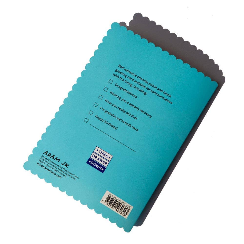 Still Alive Chenille Patch Gift Card x Adam JK Details Self-adhesive chenille patch and blank greeting card suitable for communication with the living, including: - Congratulations - Wishing you a speedy recovery - Wow you really did that - I'm grateful we're both here - Happy Birthday! - ____________ About the artist Adam J. Kurtz (aka Adam JK) is a designer, artist, author and speaker whose illustrative work is rooted in honesty, humor and a little darkness. His books have been translated into over a dozen languages. Kurtz speaks frankly about channeling human emotion into our art, and generally just trying to be more okay with whatever we’ve got. Specifications - 17.5 x 12.5 cm