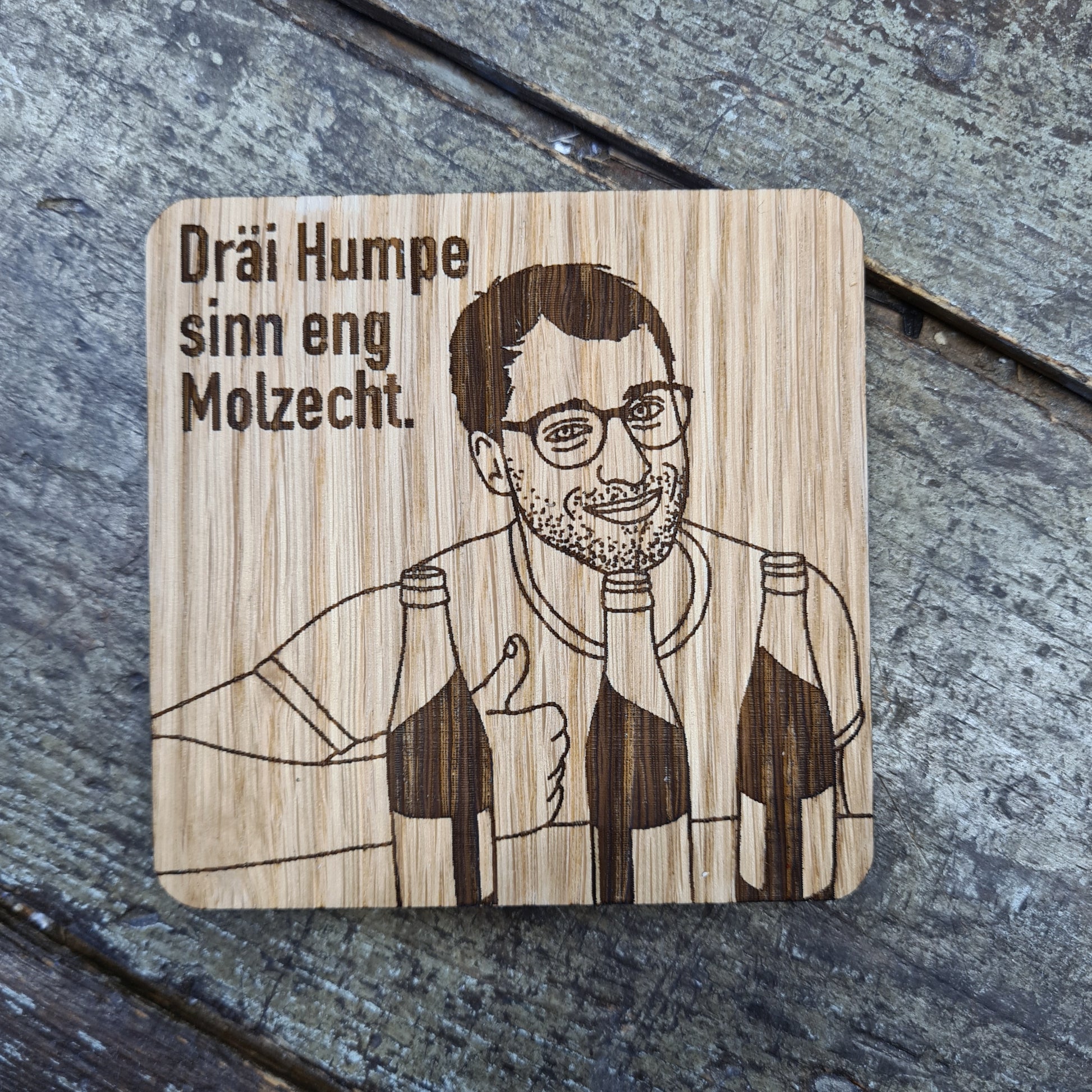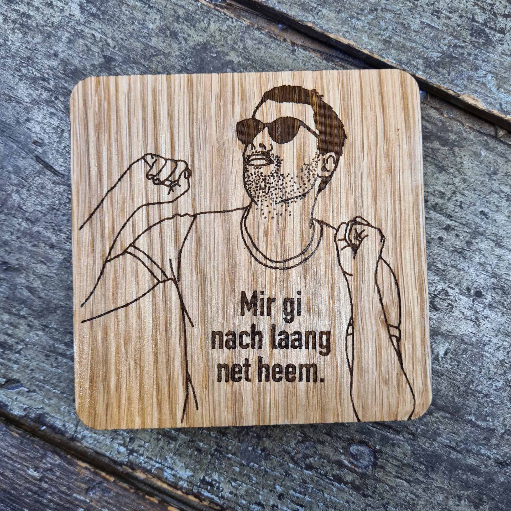 Material: 6 mm Eichenholz. Versiegelt, also flüssigkeitsbeständig.