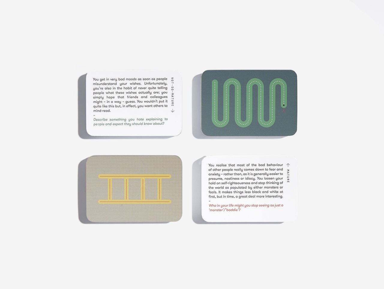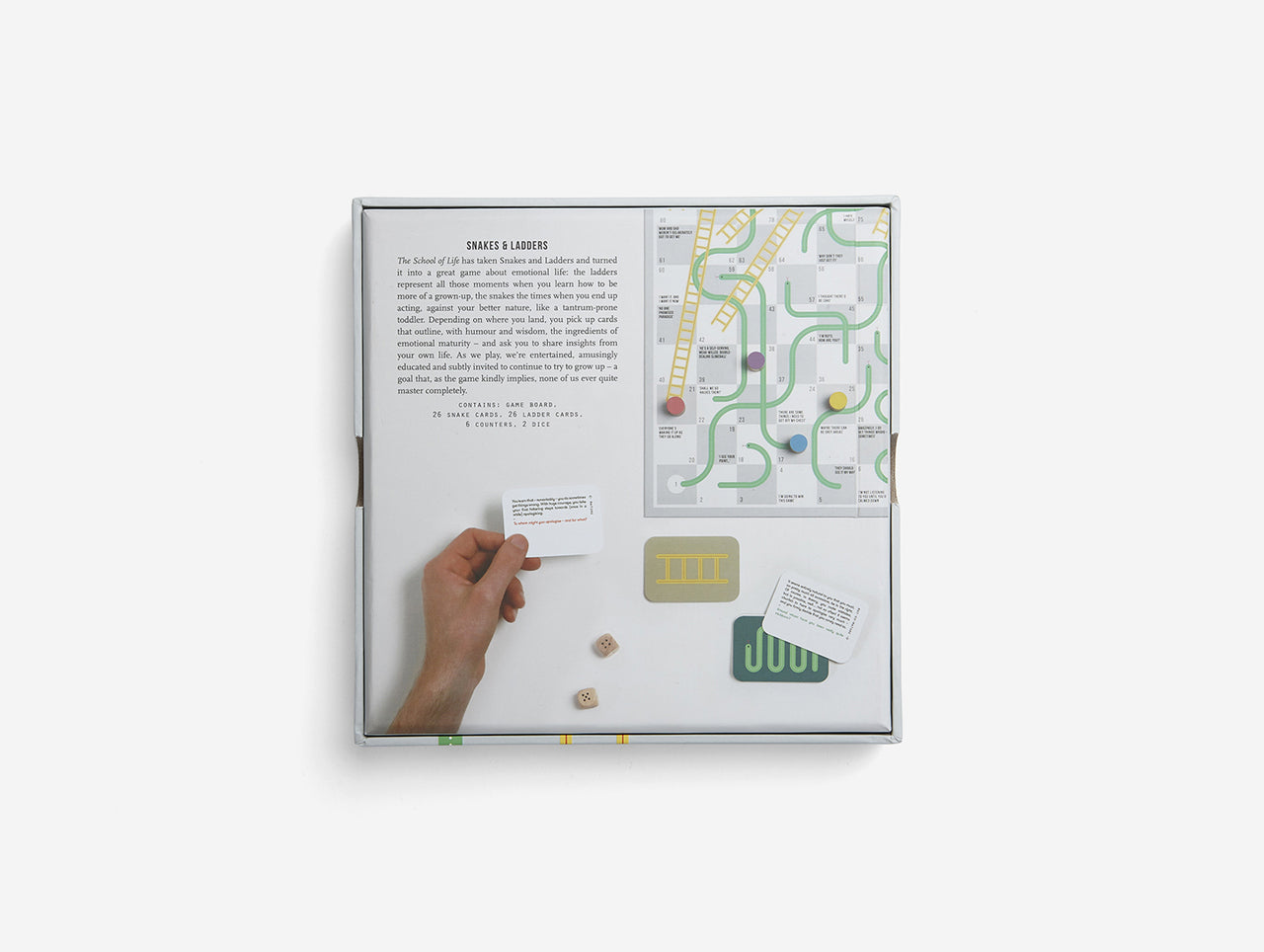 The School of Life has taken Snakes and Ladders and turned it into a great game about emotional life: the ladders represent all those moments when you learn how to be more of a grown-up, the snakes the times when you end up acting, against your better nature, like a tantrum-prone toddler. Depending on where you land, you pick up cards that outline, with humour and wisdom, the ingredients of emotional maturity - and ask you to share insights from your own life. As we play, we’re entertained, amusingly educated and subtly invited to continue to try to grow up - a goal that, as the game kindly implies, none of us ever quite master completely.
