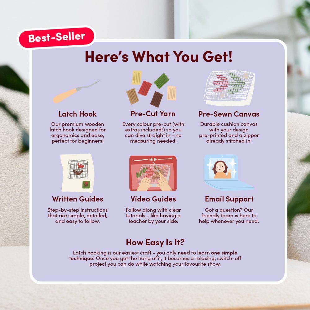 Inside, you’ll get all the yarn, tools, and instructions you need — plus our easy-to-follow video tutorial so you can create confidently, no matter your skill level. It’s time to romanticise the creative in you. You got this. Measurements: 43cm x 43cm (best fits 50cm x 50cm cushion which is not included).